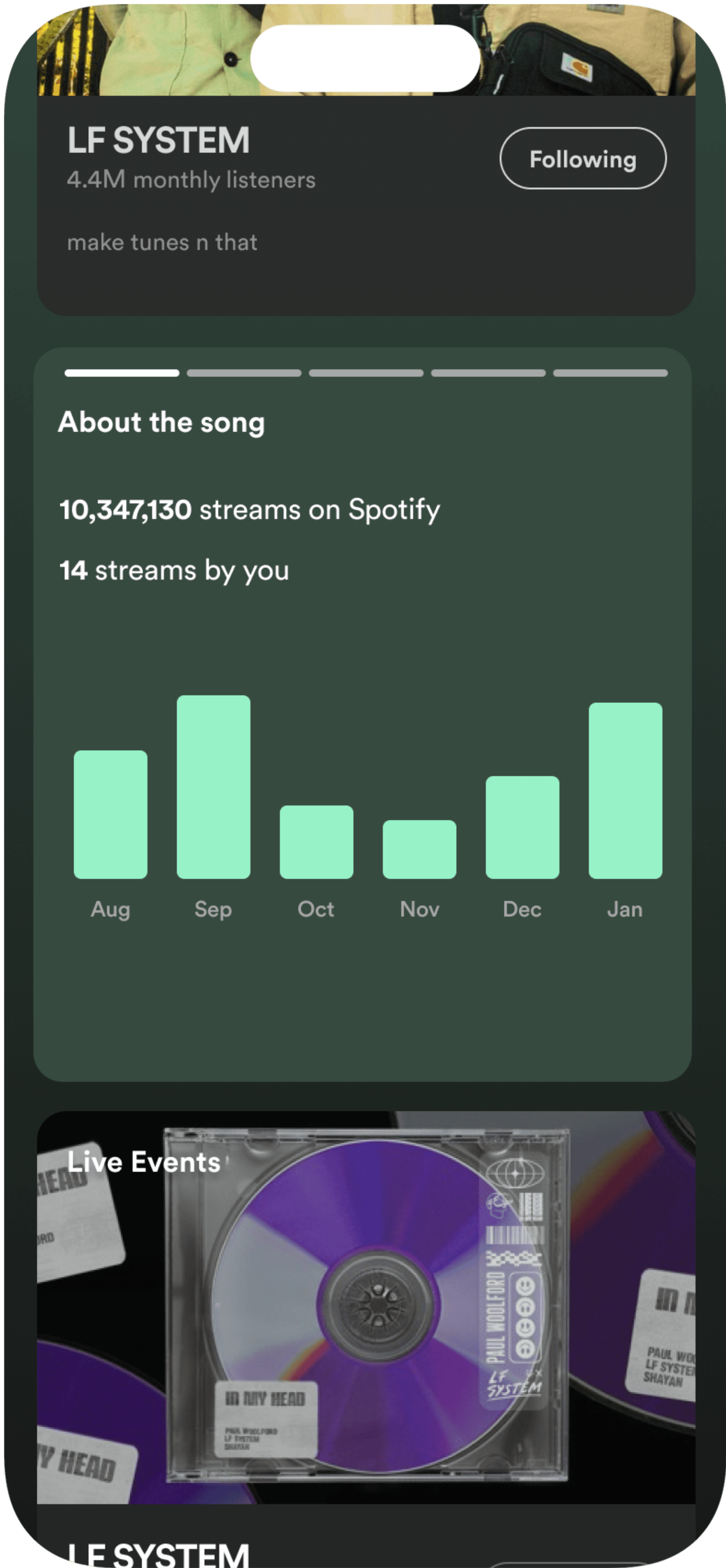 New About the Song card with personal listening statistics, song credits, sample history, countries with the top 5 plays, and song bio.
