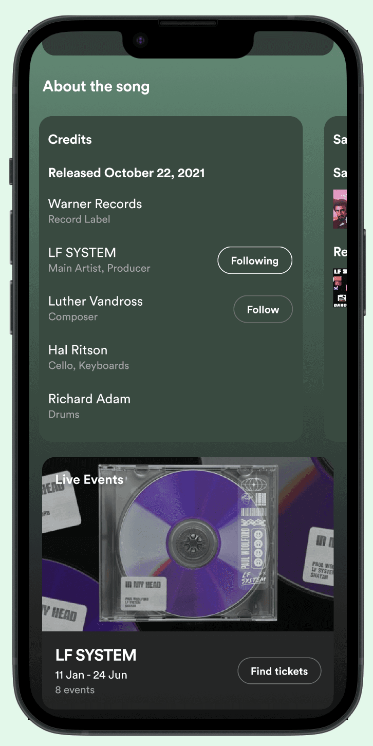At the start of this project, Spotify’s song credits were hidden in the song’s overflow menu, and after I had planned to include them in About the Song, Spotify moved them to the bottom of the Now Playing screen. Great minds think alike?`